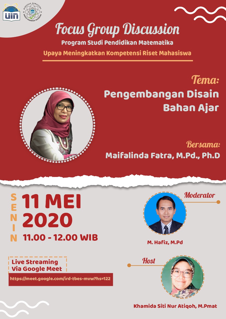 Acara ini dilaksanakan pada hari Senin, 11 Mei 2020 secara online, dengan Narasumber Maifalinda Fatra, M.Pd., Ph.D dengan moderator M.Hafiz, M.Pd. Peserta yang ikut berpartisipasi adalah dosen program studi pendidikan matematika dan mahasiswa di program studi pendidikan matematika angkatan 2013, angkatan 2014, angkatan 2015 serta alumni.