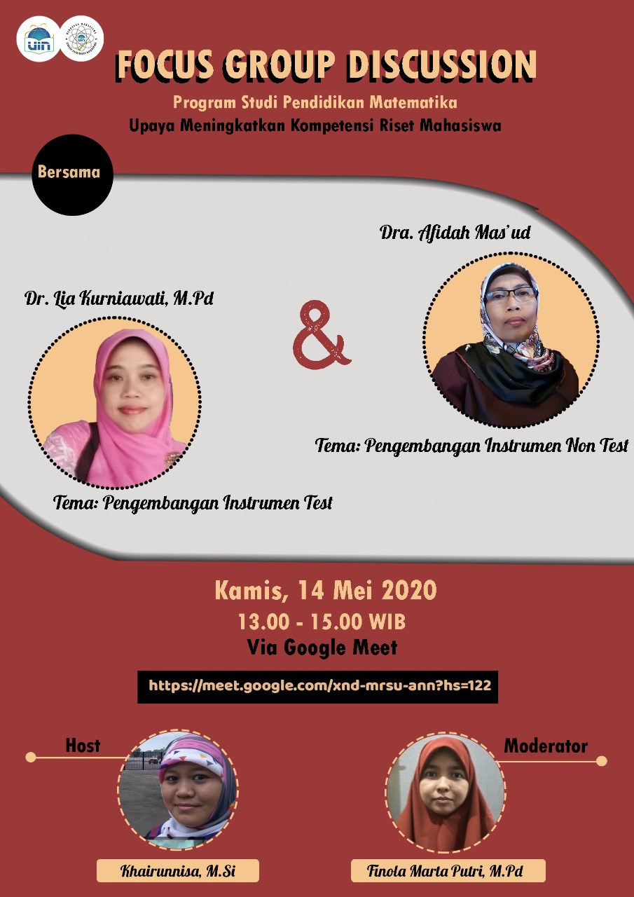 Setelah sukses melaksanakan kegiatan FGD yang pertama, selanjutnya Prodi Pendidikan Matematika FITK UIN Syarif Hidayatullah Jakarta mennyelenggarakan FGD yang kedua dengan tema: Pengembangan Instrumen Tes dan Non Tes. Acara ini dilaksanakan pada hari Kamis, 14 Mei 2020 secara online, dengan Narasumber Dr. Lia Kurniawati M.Pd. yang membahas materi tentang pengembangan instrumen tes, dengan pemaparan materi tentang tipe soal PG, tipe soal uraian. dan Dra. Afidah Mas’ud yang membahas materi tentang pengembangan instrumen non tes, dengan pemaparan materi: Angket, Lembar wawancara, skala dan penskoran.