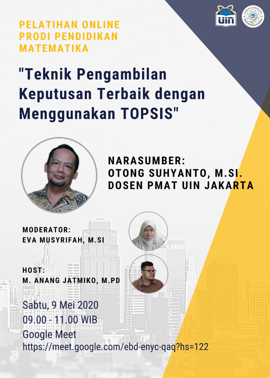 Kegiatan Pelatihan Teknik Pengambilan Keputusan dengan menggunakan TOPSIS dilaksanakan oleh prodi Pendidikan Matematika FITK pada hari Sabtu, 9 Mei 2020 secara online. Narasumber pada acara pelatihan ini adalah Otong Suhyanto, M.Si dengan moderator Eva Musyrifah, M.Si. Tujuan diadakannya Kegiatan pelatihan ini untuk mengupgrade dosen-dosen dalam menganalisis data penelitian. Selama ini software untuk analisis data yang sering digunakan oleh dosen adalah SPSS, maka dengan kegiatan ini para dosen diberikan ilmu baru tentang analisis dengan menggunakan TOPSIS dalam teknik pengambilan keputusan. Selama kegiatan, dosen melakukan praktek secara langsung dengan bimbingan narasumber bagaimana cara menginput data sampai pada analisis data. Peserta yang hadir dalam pelatihan adalah dosen di prodi matematika FITK UIN Jakarta dan mahasiswa pendidikan matematika program pascasarjana UPI