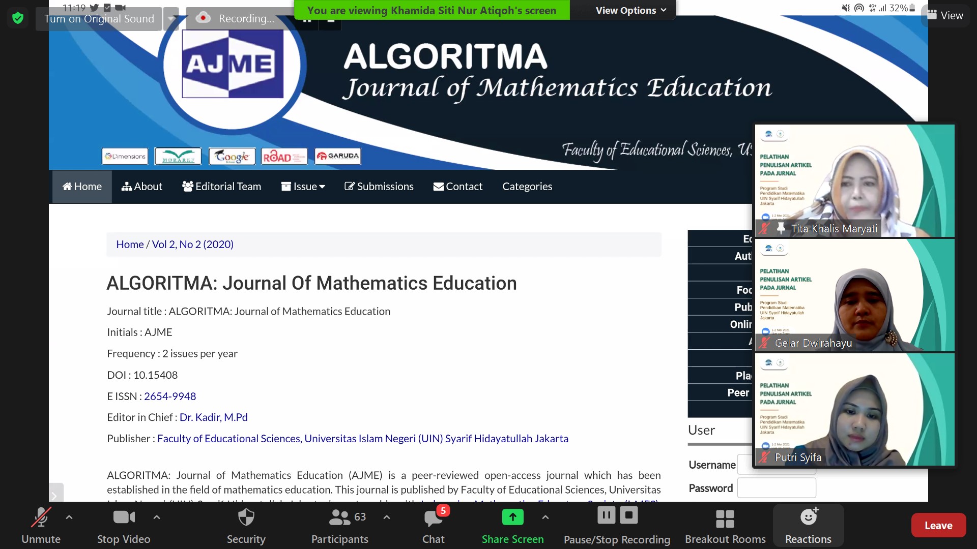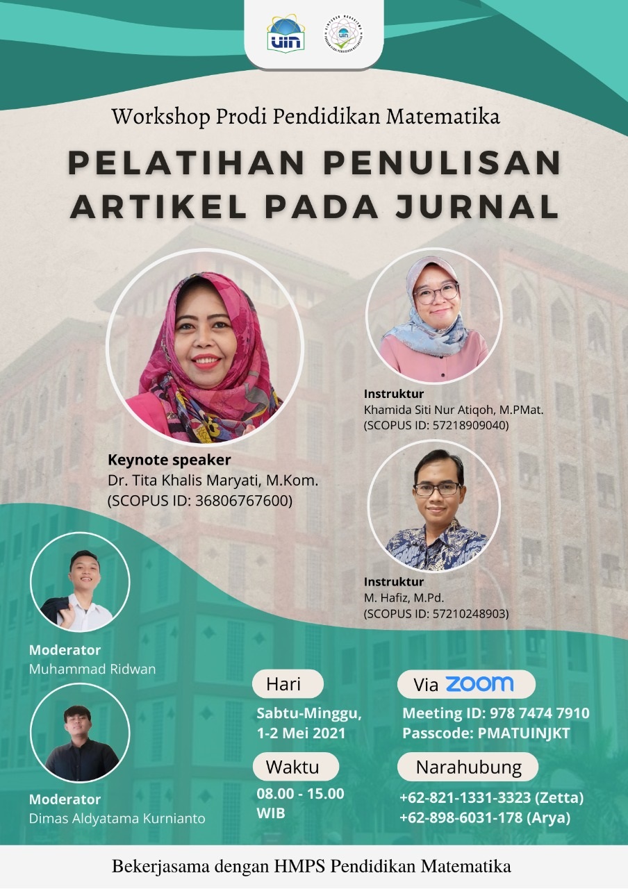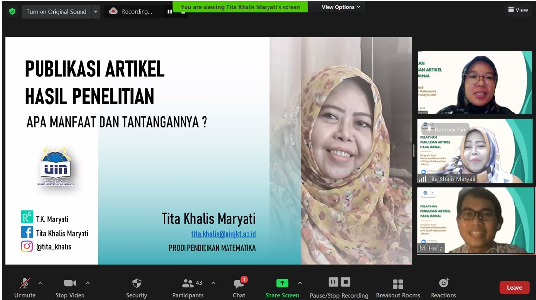 Prodi Pendidikan Matematika FITK UIN Syarif Hidayatullah melaksanakan kegiatan Pelatihan Penulisan Artikel pada tanggal 1-2 Mei 2021 dengan tujuan untuk menghasilkan artikel yang siap dipublikasikan pada beberapa jurnal nasional bereputasi. Acara pelatihan dibuka oleh Dekan FITK UIN Syarif Hidayatullah, ibu Dr. Sururin, M.Ag dan dihadiri oleh Wakil Dekan bidang Akademik, Wakil Dekan Bidang Administrasi, Wakil Dekan Bidang Kemahasiswaan. Dalam kegiatan ini, Dr. Tita Khalis Maryati, M.Kom sebagai keynote Speaker menyampaikan materi dengan tema “Publikasi Artikel Hasil Penelitian, apa manfaat dan tantangannya?”, dan Ibu Khamida Siti Nur Atiqoh, M.PMat dan Bapak M.Hafiz, M.Pd sebagai Instruktur yang membimbing para peserta workshop untuk mengubah tugas akhir (skripsi) menjadi artikel yang sesuai dengan berbagai template dari berbagai jurnal. Kegiatan ini dilaksanakan atas kerjasama Prodi Pendidikan Matematika dengan HMPS Pendidikan Matematika. Peserta yang hadir terdiri dari alumni pendidikan matematika, dosen-dosen FITK, mahasiswa prodi pendidikan matematika.