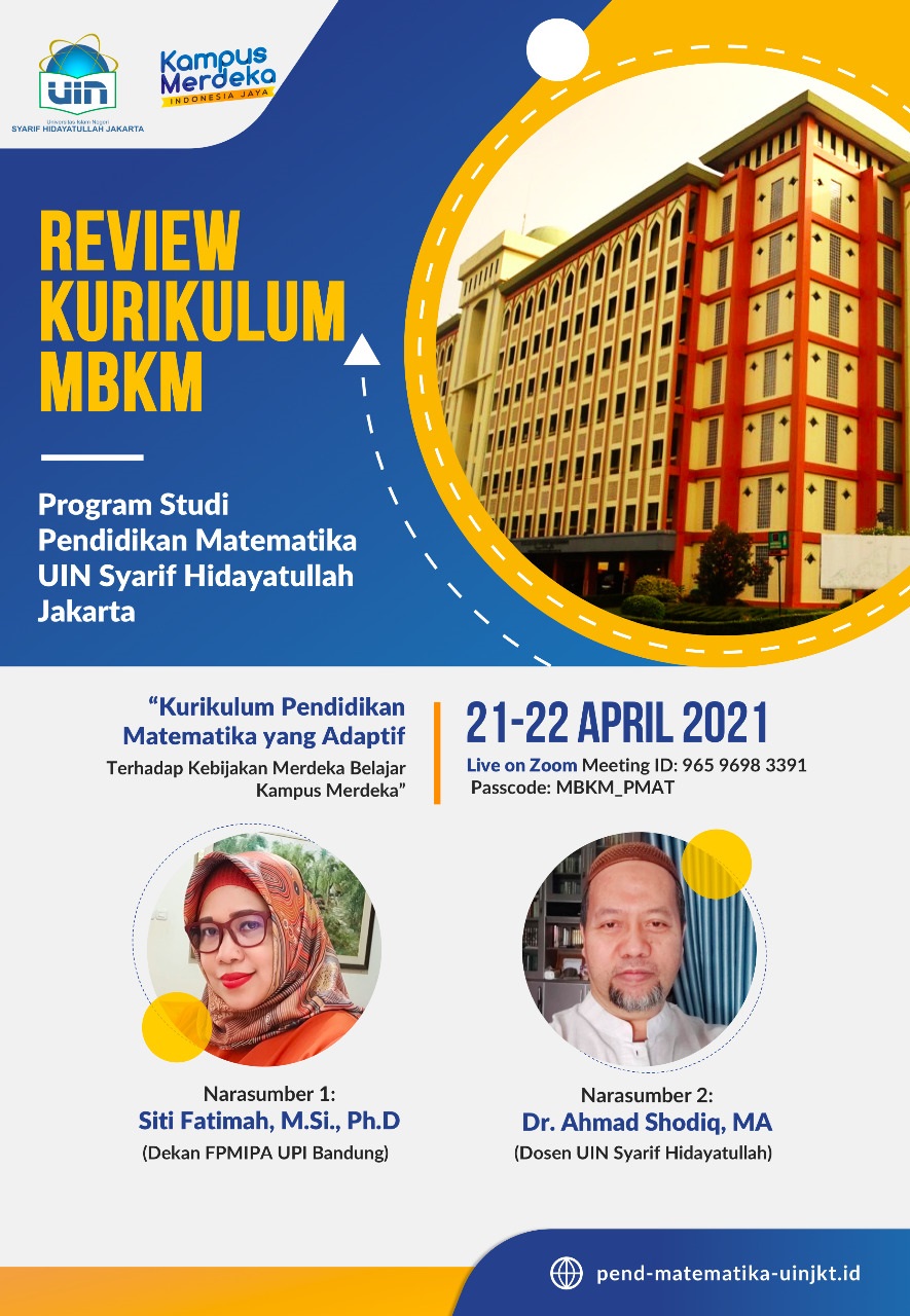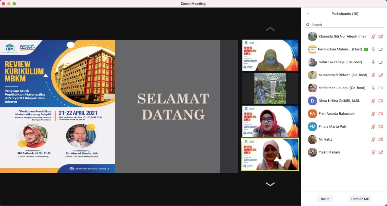 Prodi Pendidikan Matematika FITK UIN Syarif Hidayatullah melaksanakan kegiatan Workshop Kurikulum Merdaka Belajar Kampus Merdeka (KMBKM) selama dua hari yaitu tanggal 22 – 23 April 2021 dengan tema “Kurikulum pendidikan matematika yang adaptif terhadap kebijakan merdeka belajar kampus merdeka”. Tujuan dari pelaksanaan workshop ini yaitu: 1) mereview draft kurikulum prodi pendidikan matematika tahun 2020, dan 2) workshop penyusunan RPS. Dalam kegiatan ini prodi mengundang dua narasumber yang merupakan pakar dalam bidang pendidikan matematika yaitu Ibu Siti Fatimah, M.Si, Ph.D. (Dosen dari Universitas Pendidikan Indonesia) dan pakar dalam bidang integrasi keilmuan yaitu Bapak Dr. Akhmad Sodiq, M.Ag (Dosen dari UIN Syarif Hidayatullah Jakarta). Kegiatan dibuka oleh Dekan FITK UIN Syarif Hidayatullah, ibu Dr. Sururin, M.Ag dan dihadiri oleh Wakil Dekan bidang Akademik, Wakil Dekan Bidang Administrasi, seluruh dosen Pendidikan Matematika, stakeholder, alumni, dan beberapa perwakilan dari mahasiswa. Stakehoder yang hadir terdiri dari: